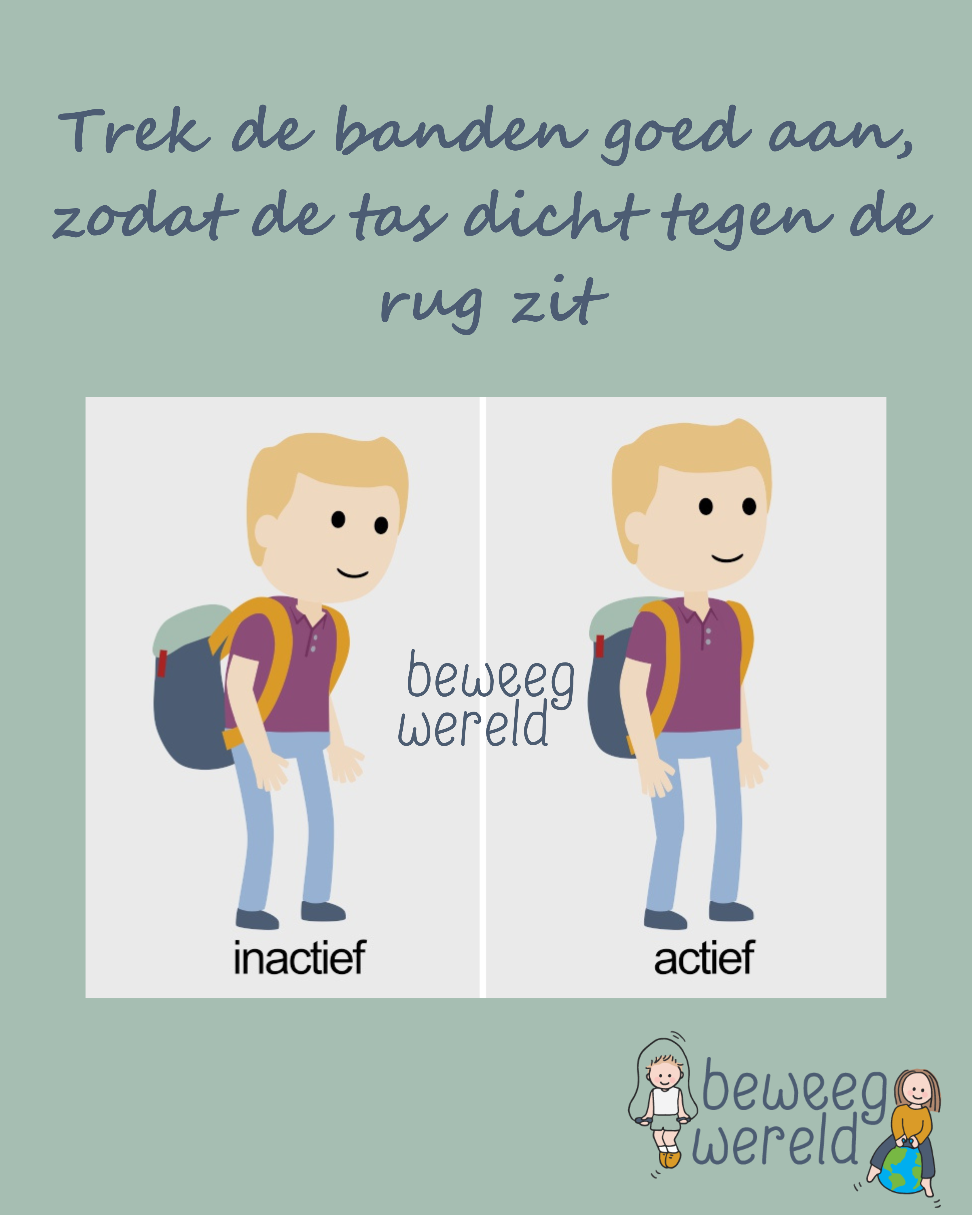Zorg dat de schouderbanden goed strak zitten, zodat de tas dicht tegen de rug zit. Zo blijft het zwaartepunt op de juiste plek en vermijd je overbelasting.