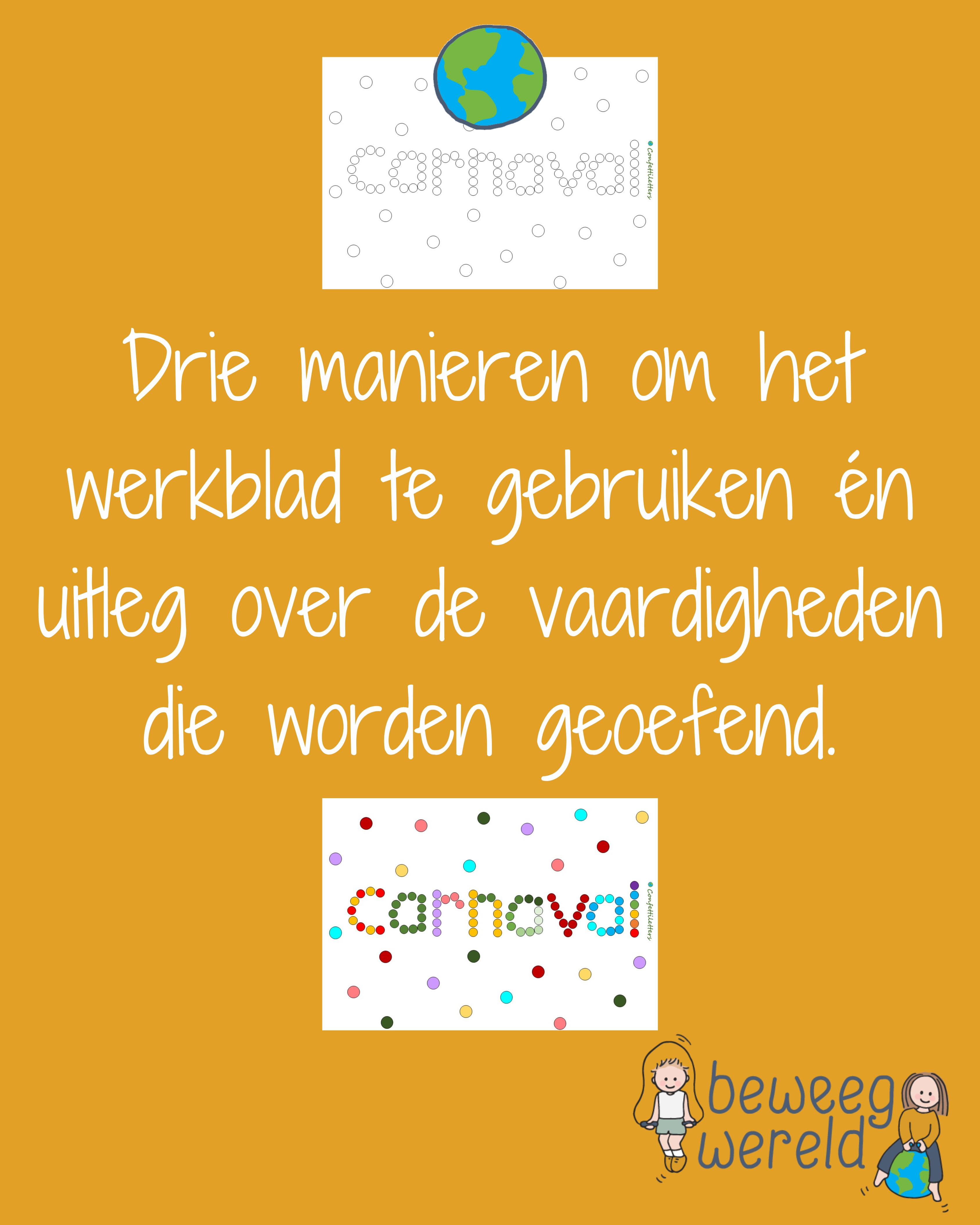 Carnaval is kleur, feest en beweging. Met deze vrolijke confettiletters maken kinderen hun eigen feestwoord. De letters bestaan uit kleine ronde stippen die samen het woord carnaval vormen. Perfect om spelenderwijs te werken aan de fijne motoriek.