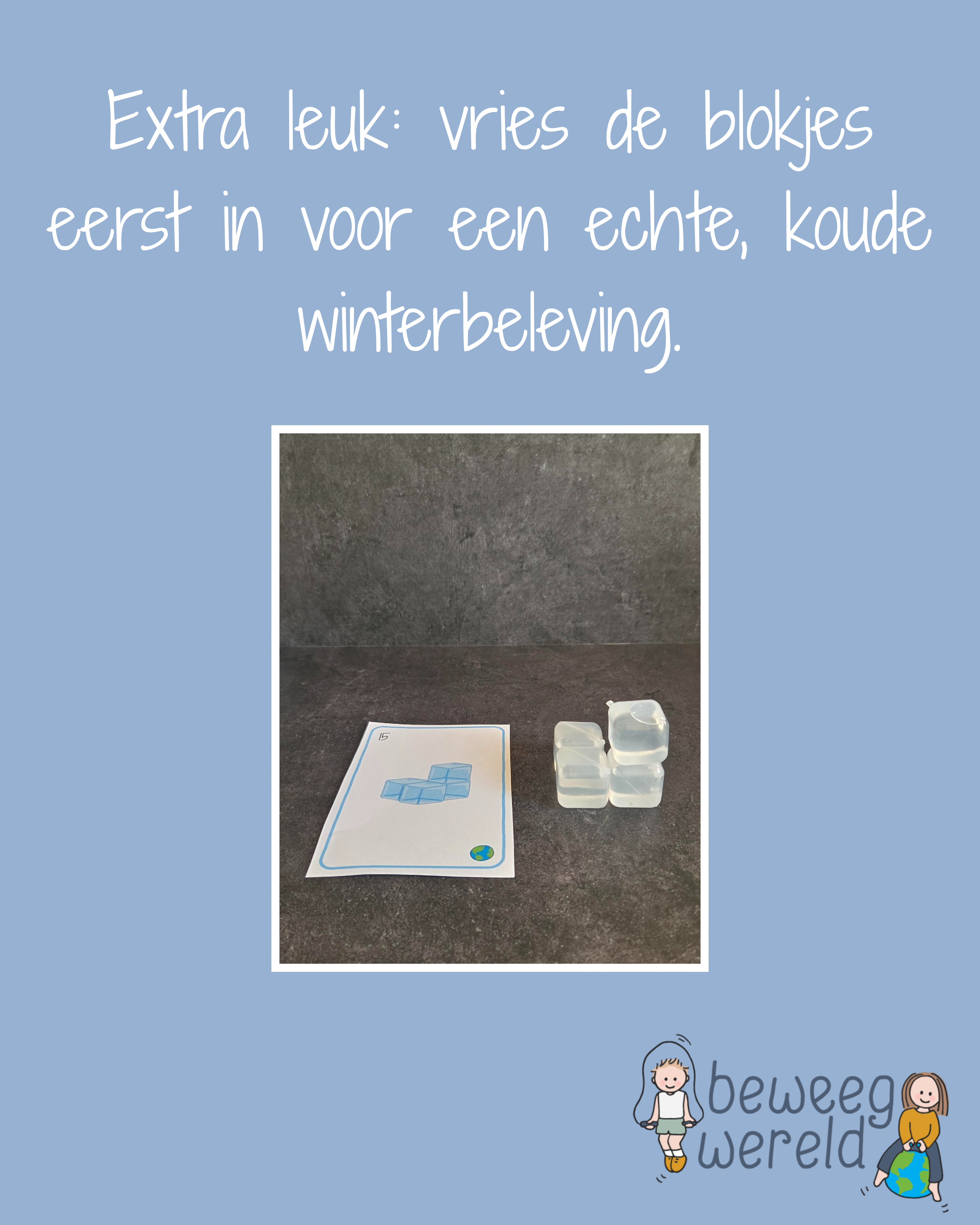 Daarnaast kunnen de ijsblokjes gebruikt worden om letters na te leggen. Door lettervormen aan te bieden die zijn opgebouwd uit rechte blokjes, leren kinderen het verschil zien tussen rechte en gebogen lijnen. Er is bewust gekozen voor voorbeelden met een grondlijn, zodat kinderen ook kennismaken met letters die boven of onder de rompzone uitsteken. Zo wordt spel gecombineerd met een eerste oriëntatie op lettervormen en schrijfontwikkeling.
