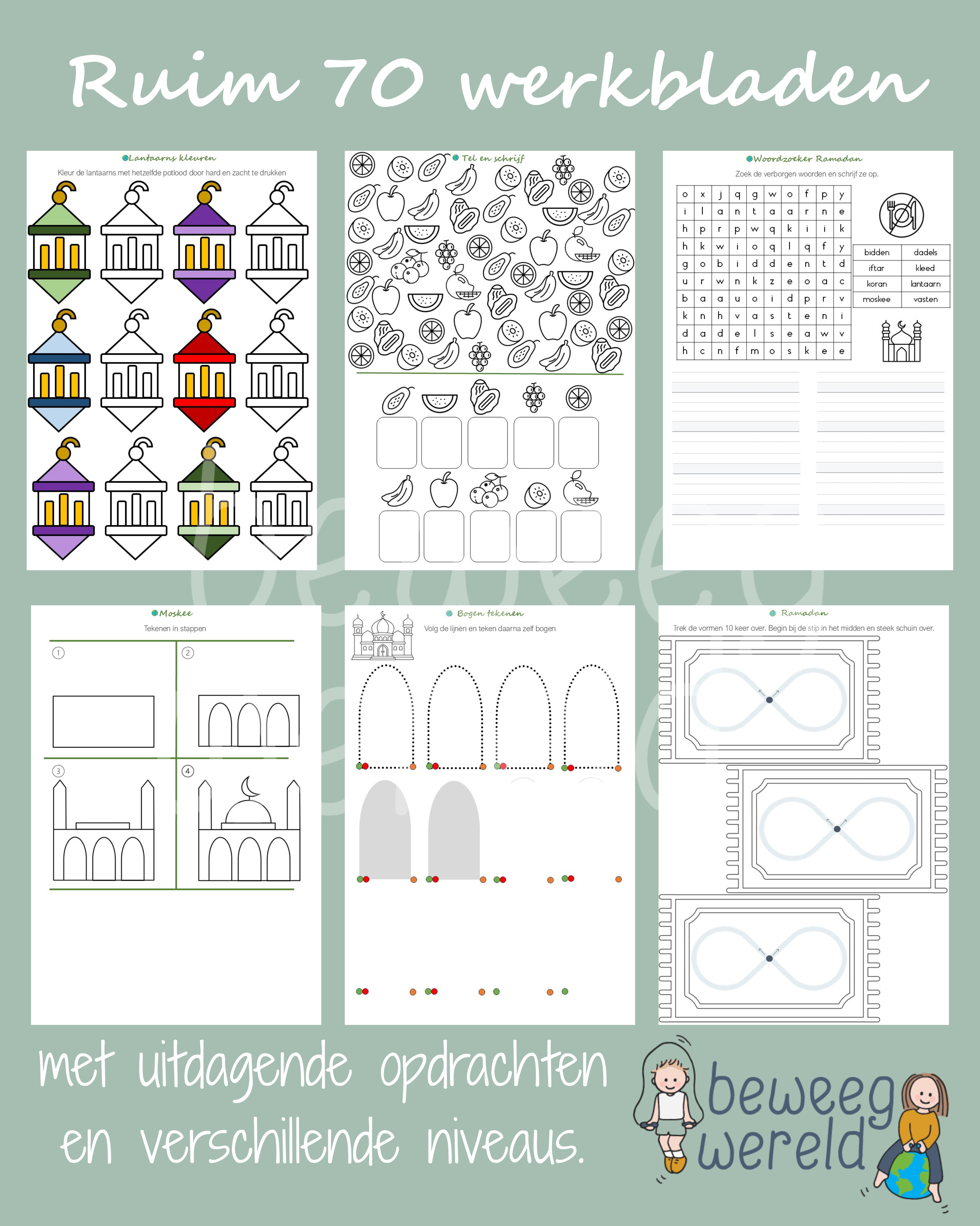 De bundel biedt een doordachte opbouw en veel variatie. Kinderen oefenen met lijnen, vormen en patronen die aansluiten bij het thema, zoals lantaarns, maantjes en moskeeën. Daarnaast zijn er werkbladen voor het schrijven van losse woorden en zinnen met begrippen die passen bij Ramadan, zoals vasten, iftar en dadels. Ideaal voor kinderen uit groep 1, 2, 3 én 4.