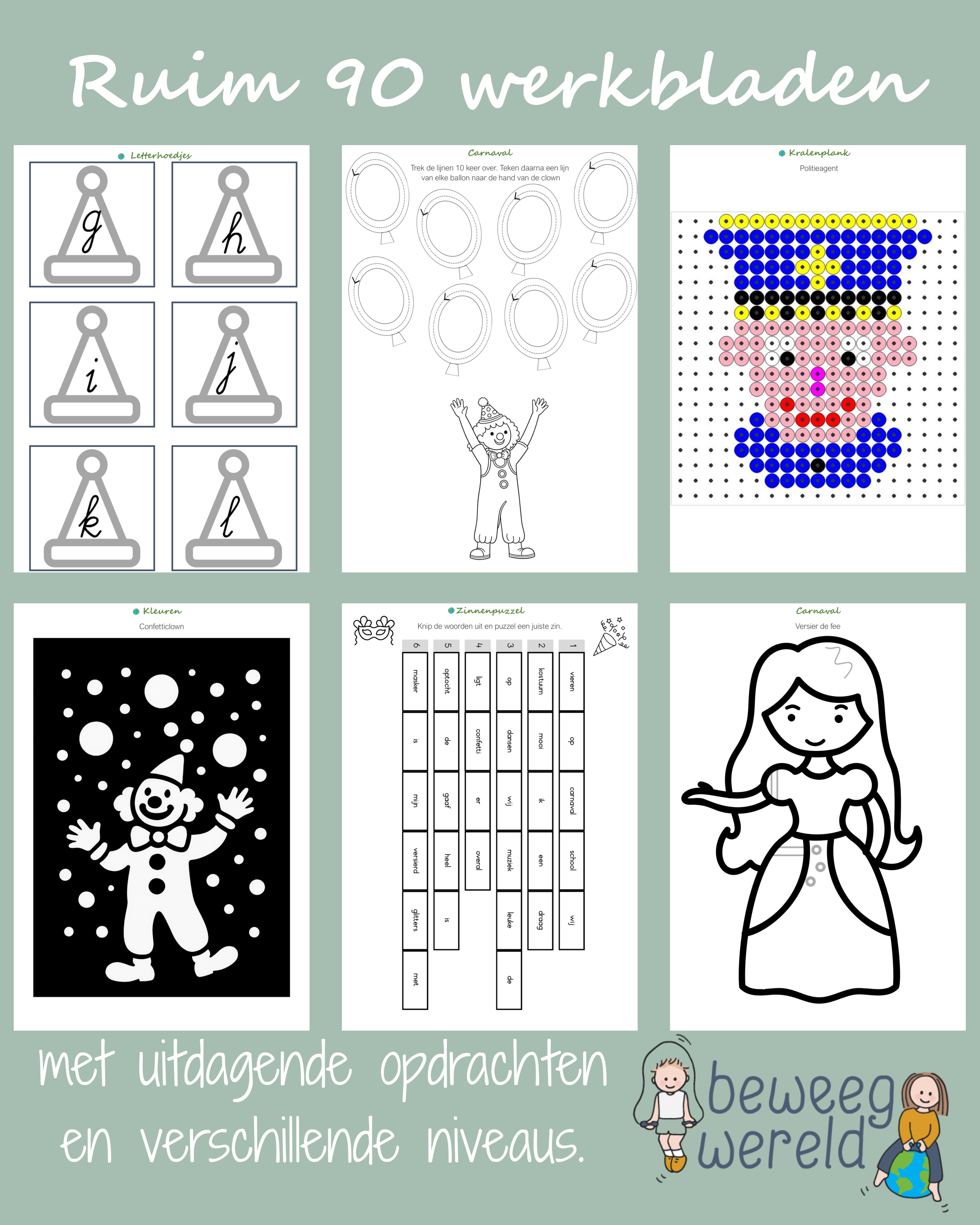 Met dit uitgebreide pakket van ruim 90 werkbladen duiken kinderen spelenderwijs in het thema Carnaval. De vrolijke en aansprekende werkbladen zijn ontwikkeld voor kinderen van 5 tot ongeveer 8 jaar en richten zich op het stimuleren van de fijne motoriek, het ruimtelijk inzicht, de oog handcoördinatie, het voorbereidend schrijven en het ontwikkelen van een leesbaar en ontspannen handschrift.