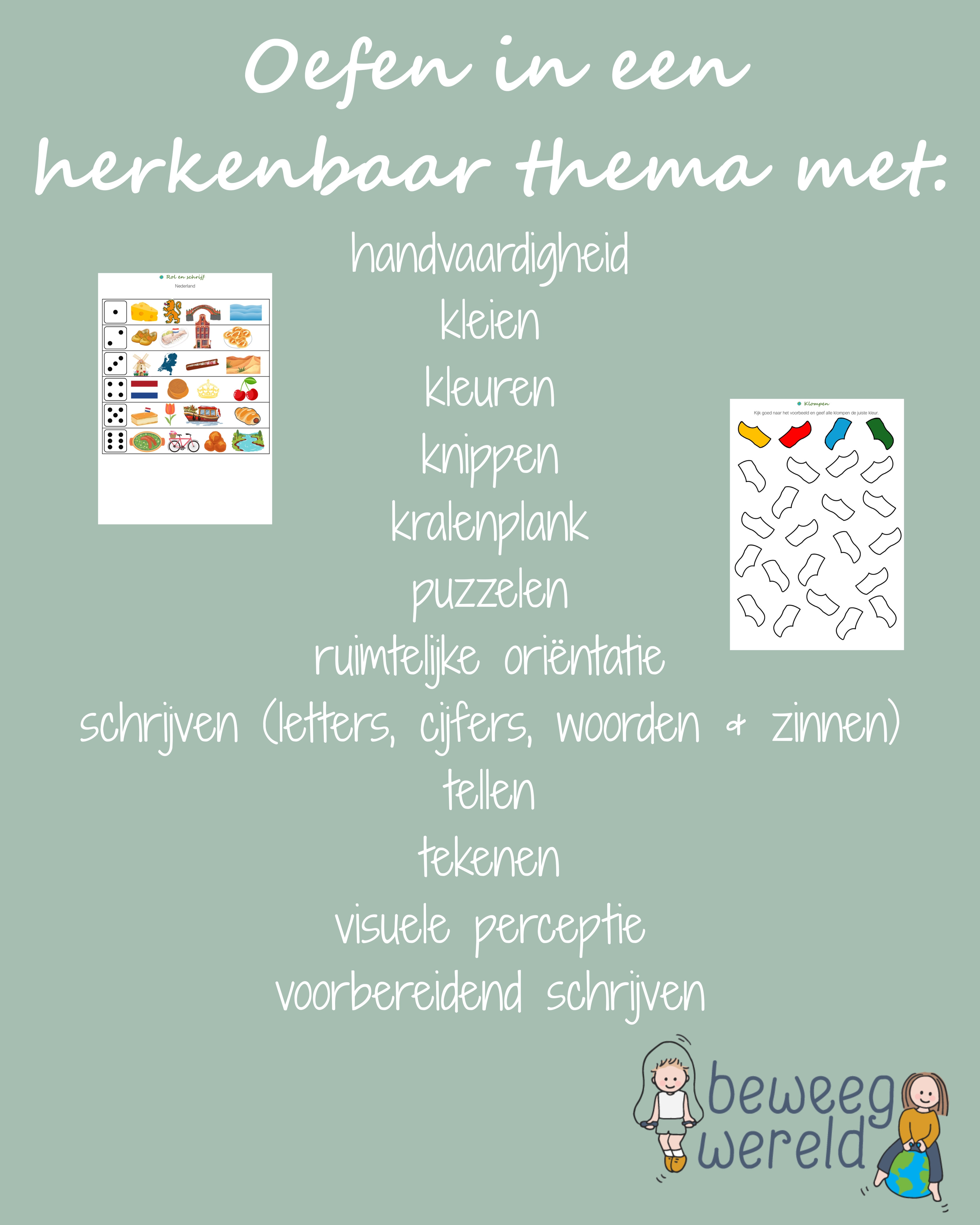 Download de themabundel Nederland en werk direct doelgericht aan motoriek, schrijven, woordenschat en concentratie binnen één samenhangend geheel.
