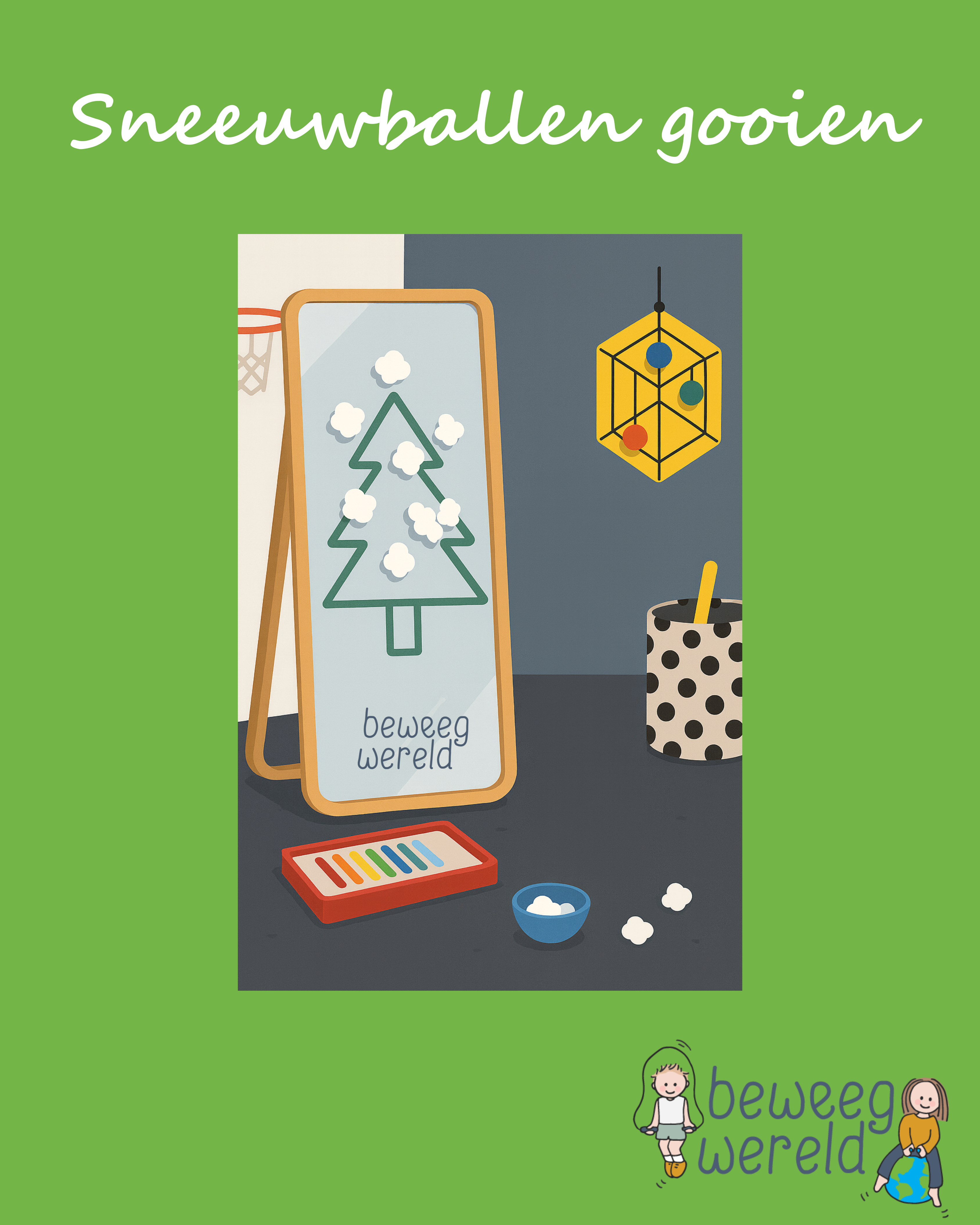 Teken met Stabilo Woody’s een grote kerstboom op een spiegel en laat kinderen natte watjes tegen de boom gooien. De watjes blijven plakken, wat zorgt voor een direct en zichtbaar resultaat. Deze activiteit stimuleert de oog-handcoördinatie, balvaardigheid en schouderstabiliteit. Bovendien is het een speelse manier om beweging toe te voegen, zelfs op koude winterdagen.