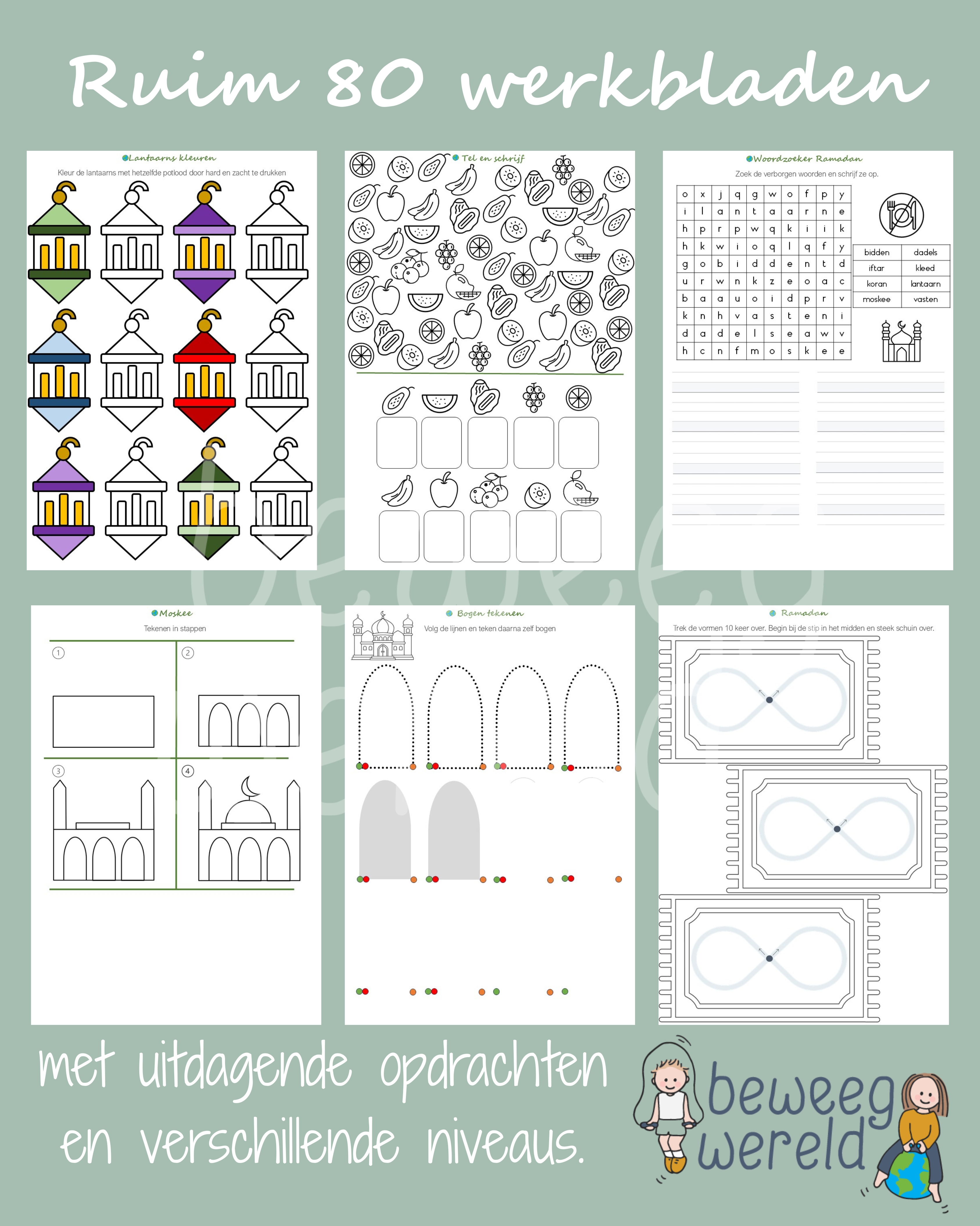 De bundel biedt een doordachte opbouw en veel variatie. Kinderen oefenen met lijnen, vormen en patronen die aansluiten bij het thema, zoals lantaarns, maantjes en moskeeën. Daarnaast zijn er werkbladen voor het schrijven van losse woorden en zinnen met begrippen die passen bij Ramadan, zoals vasten, iftar en dadels. Ideaal voor kinderen uit groep 1, 2, 3 én 4.